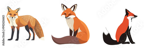 Obraz premium Three Cartoon Foxes Isolated on White Background, fox, animal, wildlife,...