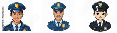 © YiuCheung, Fototapeta premium Three cartoon illustrations of police officers with varying styles.