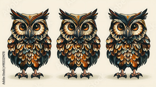© Elnare, Fototapeta premium Three cartoon owls with intricate feathers and a small golden bell.