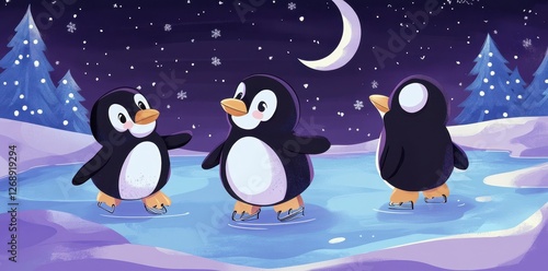 Fototapeta premium Three cartoon penguins are ice skating under a crescent moon