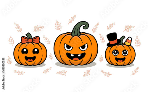 Fototapeta premium Three cartoon pumpkins with leaves halloween cute