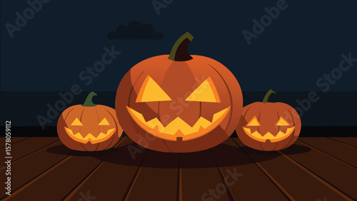 Obraz premium Three carved halloween pumpkins on wooden surface with night background illustration
