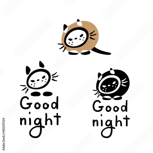 © Tatiana, Fototapeta premium Three cat icons and Good Night lettering. Hand-drawn cartoon collection. Vector illustration