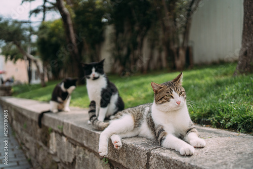 © Svetlana, Fototapeta premium Three cats are lying on a stone curb. Two black-and-white cats, one gray-and-white striped