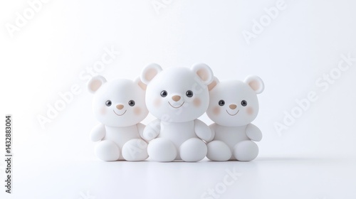Obraz premium Three Ceramic Bears Minimalist Style, Soft Lighting, High Resolution, Centered Group Shot, Smooth Textures, Friendly Togetherness, White Background, Gentle Pure Tones, Ideal for Baby Products