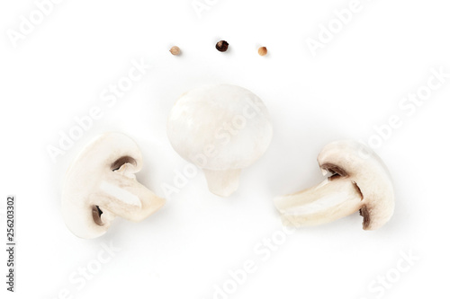 Fototapeta premium Three champignon mushrooms, shot from the top on a white background with pepper, a flatlay composition with copy space
