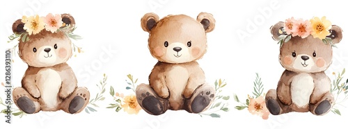 Naklejka premium Three charming bears decorated with flowers livening up any space with joy