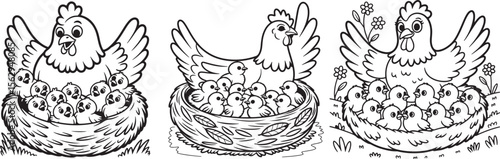 Fototapeta premium three charming cartoon hen and chick families in nests with flowers isolated...