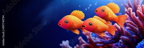 Fototapeta premium Three cheerful cartoon fish swim together in a vibrant coral reef, symbolizing friendship, underwater life, joy, ocean, and colorful nature.