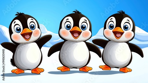 © ArtisticSnap, Naklejka premium Three cheerful cartoon penguins stand together on a snowy background, showcasing their bright personalities and cute features.