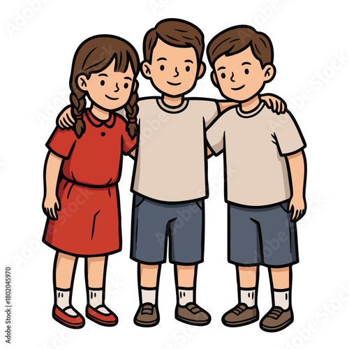 Fototapeta premium Three cheerful children standing together, smiling and enjoying friendship in...
