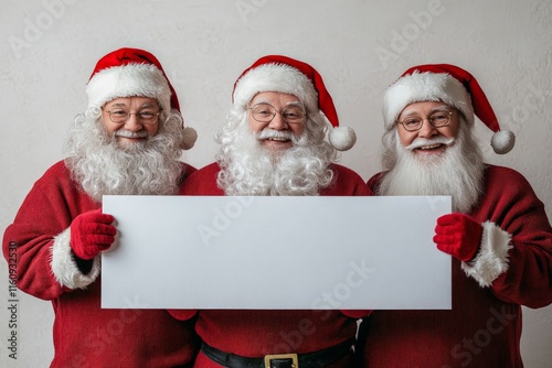© c80, Naklejka premium Three cheerful individuals dressed as Santa Claus hold up a blank sign against a plain background during the holiday season