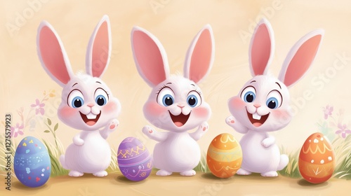 Obraz premium Three cheerful rabbits celebrate spring by painting colorful Easter eggs in a bright meadow