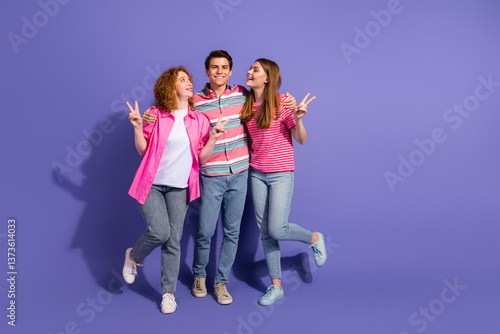 © deagreez, Fototapeta premium Three cheerful young friends posing joyfully against a purple background showcasing casual style and friendly gestures.