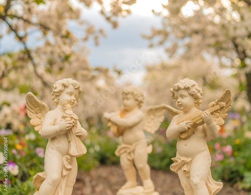 © gelas, Obraz premium Three cherubs playing instruments in a spring garden