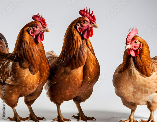 © Muhammad Saleem, Fototapeta premium Three chickens isolated on a transparent background, A beautiful wallpaper. cock and hen.
