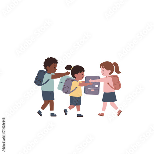 © ARIO, Obraz premium Three children interacting while carrying backpacks and school supplies.