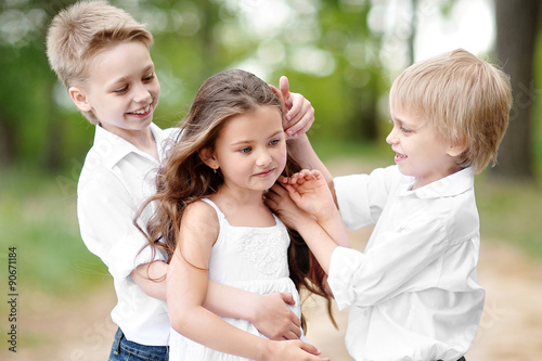 © zagorodnaya, Fototapeta premium three children playing on meadow in summer