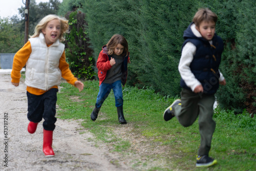 Fototapeta premium Three children running down the street