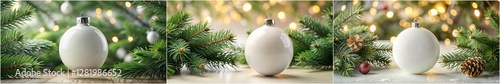 © Valeriia, Naklejka premium Three Christmas ornaments are displayed on a table. The first ornament is a white egg, the second is a white ball, and the third is a white ornament with a red star