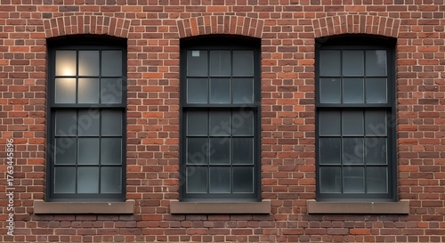 © Digion, Obraz premium Three Classic Black-Framed Windows on Red Brick Wall in Sunlight Capturing Industrial Architecture Contrast with Vintage Style