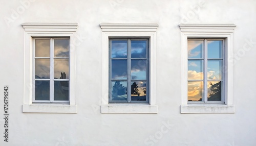 Fototapeta premium Three classic windows on a white building facade, showcasing reflections of...