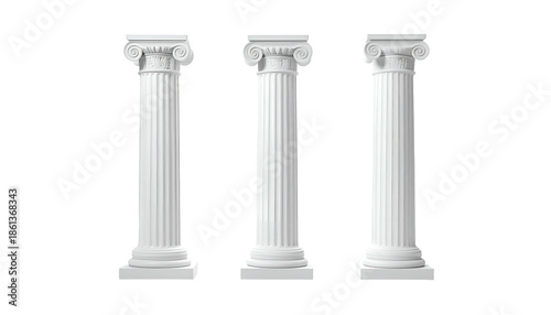 © Bilfaqih, Obraz premium Three classical white Ionic columns stand, isolated against a black background