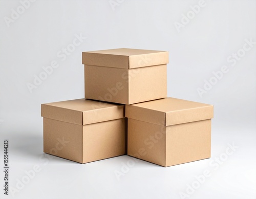 © Farida, Fototapeta premium Three closed cardboard boxes are neatly stacked against a plain white background.