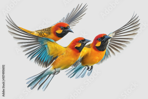 © PHAISITSAWAN, Fototapeta premium Three Colorful Birds in Flight, Captured in , Isolated Against a White Background for Use in Creative Projects