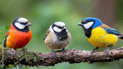 © KIMEHIME, Obraz premium Three colorful birds perched on branch, forest background, nature photography