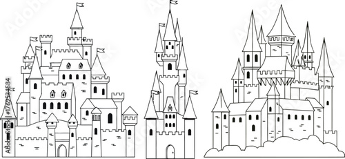 © Khalida, Obraz premium Three colorful cartoon castles with flags and towers on a white background
