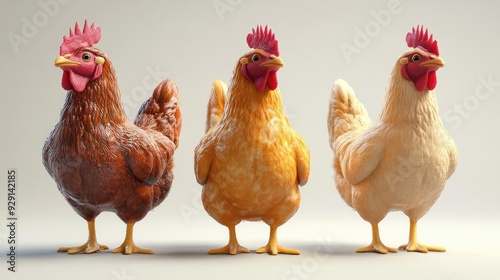 © Anapus, Fototapeta premium Three colorful chickens standing together, showcasing their unique feather patterns and vibrant combs in a light background.