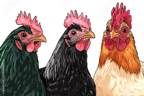 © Noufaldi, Fototapeta premium Three colorful chickens with distinct feather patterns and combs.
