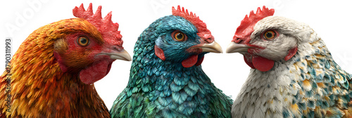 © Trendy Graphics, Fototapeta premium Three colorful chickens with vibrant plumage, including orange, teal, and speckled white, stand sidebyside against a clean transparent background