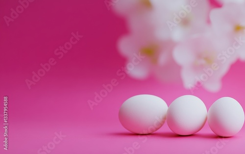 © Diffin, Fototapeta premium Three colorful eggs sit beside a blooming flower, symbolizing Easter's vibrant celebration.