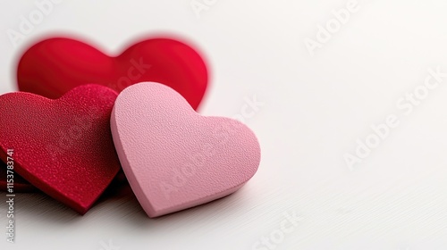 © Kritsadee, Fototapeta premium Three colorful heart-shaped decorations in red and pink, symbolizing love and affection, set against a soft, neutral background.