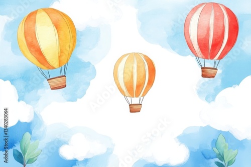 Fototapeta premium Three colorful hot air balloons drift through a bright blue sky with fluffy clouds, surrounded by soft, watercolor greenery.