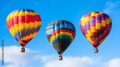 Fototapeta premium Three colorful hot air balloons float against a bright blue sky, showcasing...