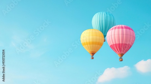© ColorfulFlowerStudio, Naklejka premium Three colorful hot air balloons float in a clear blue sky.