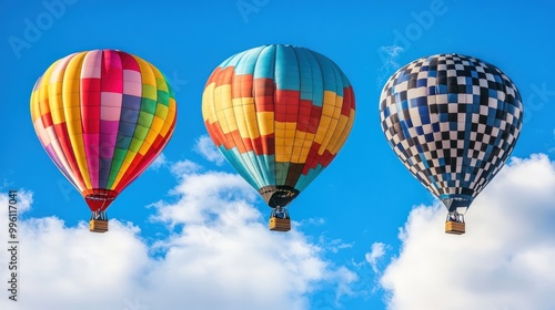 Naklejka premium Three colorful hot air balloons flying in a clear blue sky with white fluffy...