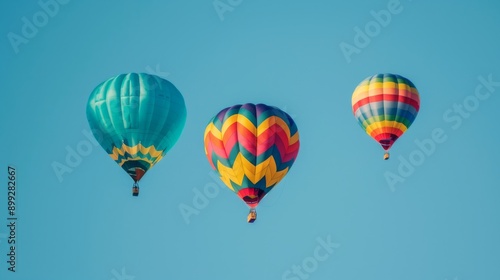Naklejka premium Three colorful hot air balloons in clear blue sky