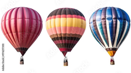 © Fotograf, Obraz premium Three colorful hot air balloons soar through the clear blue sky