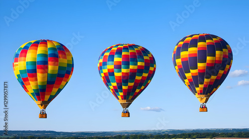 © artzone, Obraz premium Three Colorful Hot Air Balloons Soaring Against Blue Sky During Summer Day
