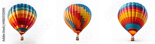 Fototapeta premium Three colorful hot air balloons with striped patterns against a white...