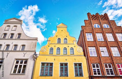 Fototapeta premium Three colorful old gabled house facades in the old town of Wismar.