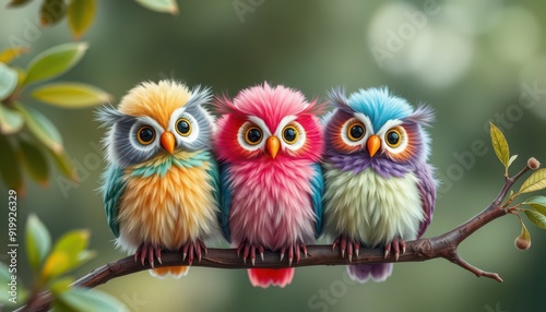 © BOJOShop, Obraz premium Three Colorful Owls Perched on a Branch.