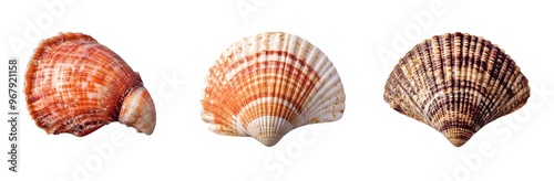 © purrfiction, Obraz premium Three colorful seashells arranged side by side.