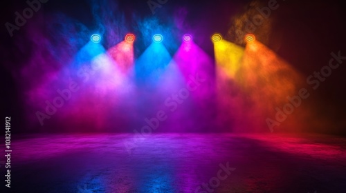 © Arifin Studio, Obraz premium Three colorful spotlights illuminate a smoky dark room.