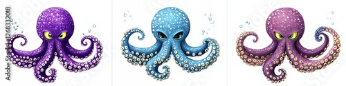 © siriwan, Fototapeta premium Three Colorful Stylized Octopuses with Expressive Features and Playful Atmosphere