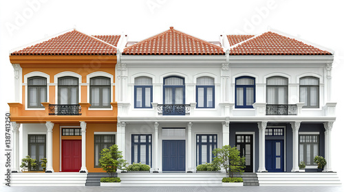© Thanthara, Fototapeta premium Three colorful terrace houses with ornate details and plants in front
